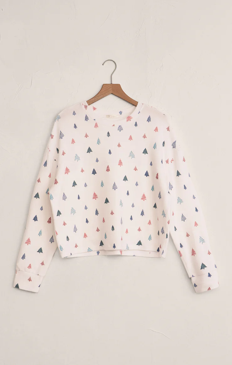 This brushed sweater knit brings a cozy feel with a touch of winter charm. Featuring a whimsical alpine tree print, this long-sleeve crewneck is ready for fireside lounging or festive weekends.