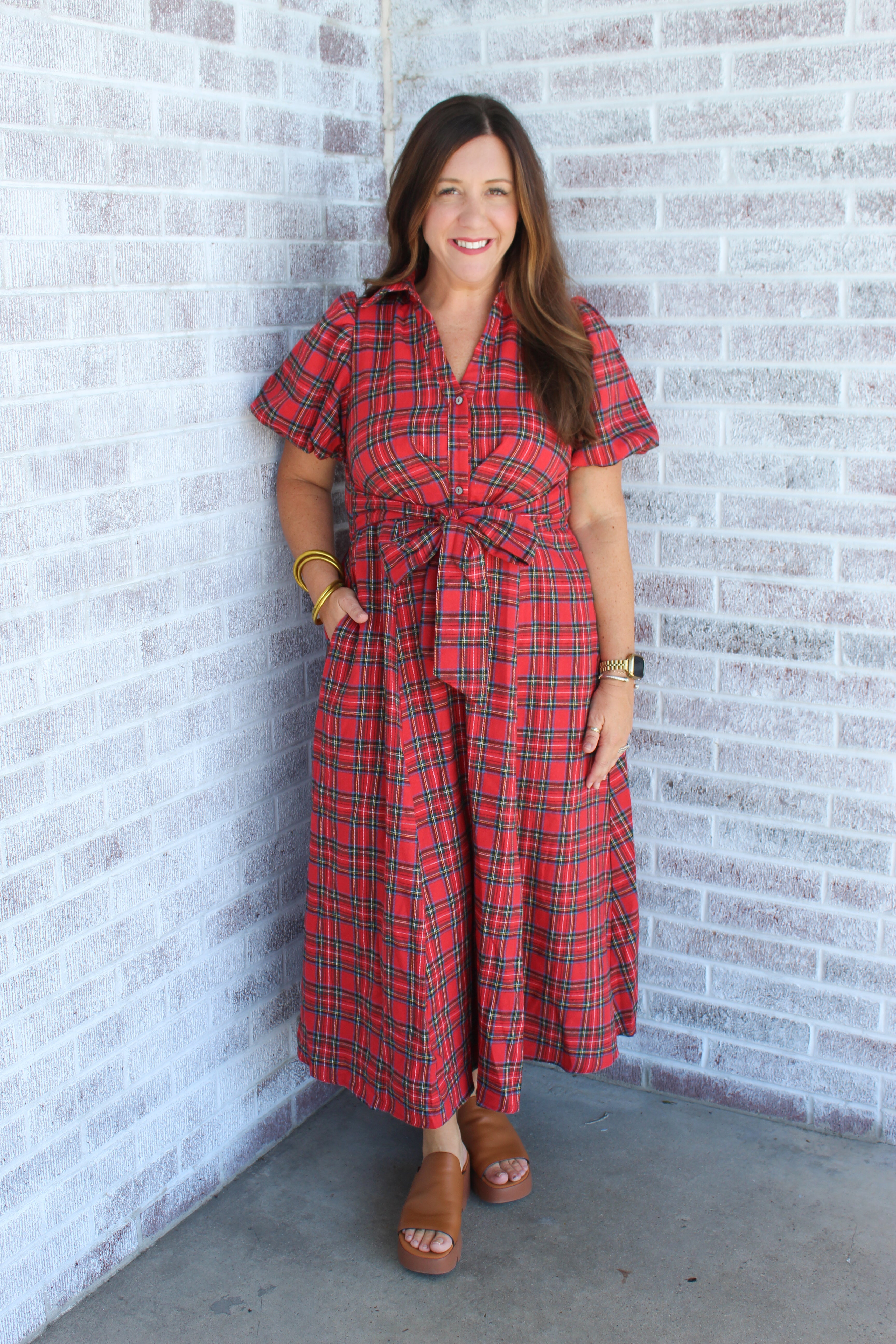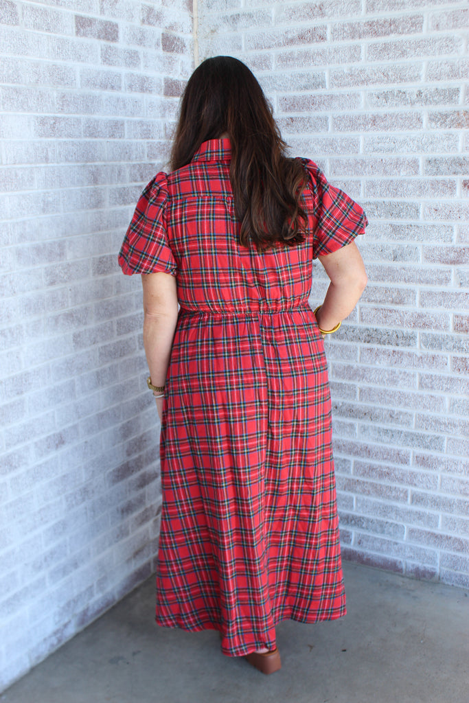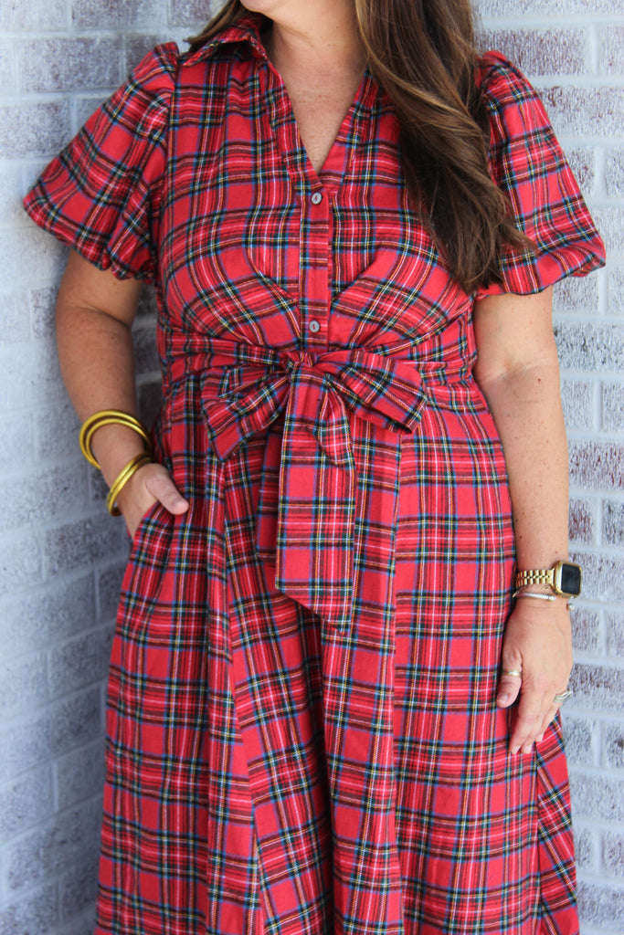 January & May Holiday - I Saw Santa Plaid Puff Sleeve Midi Dress w/ Bow