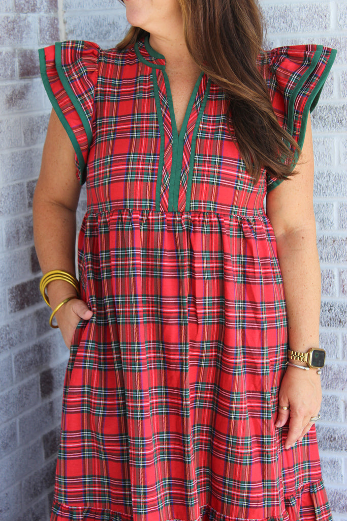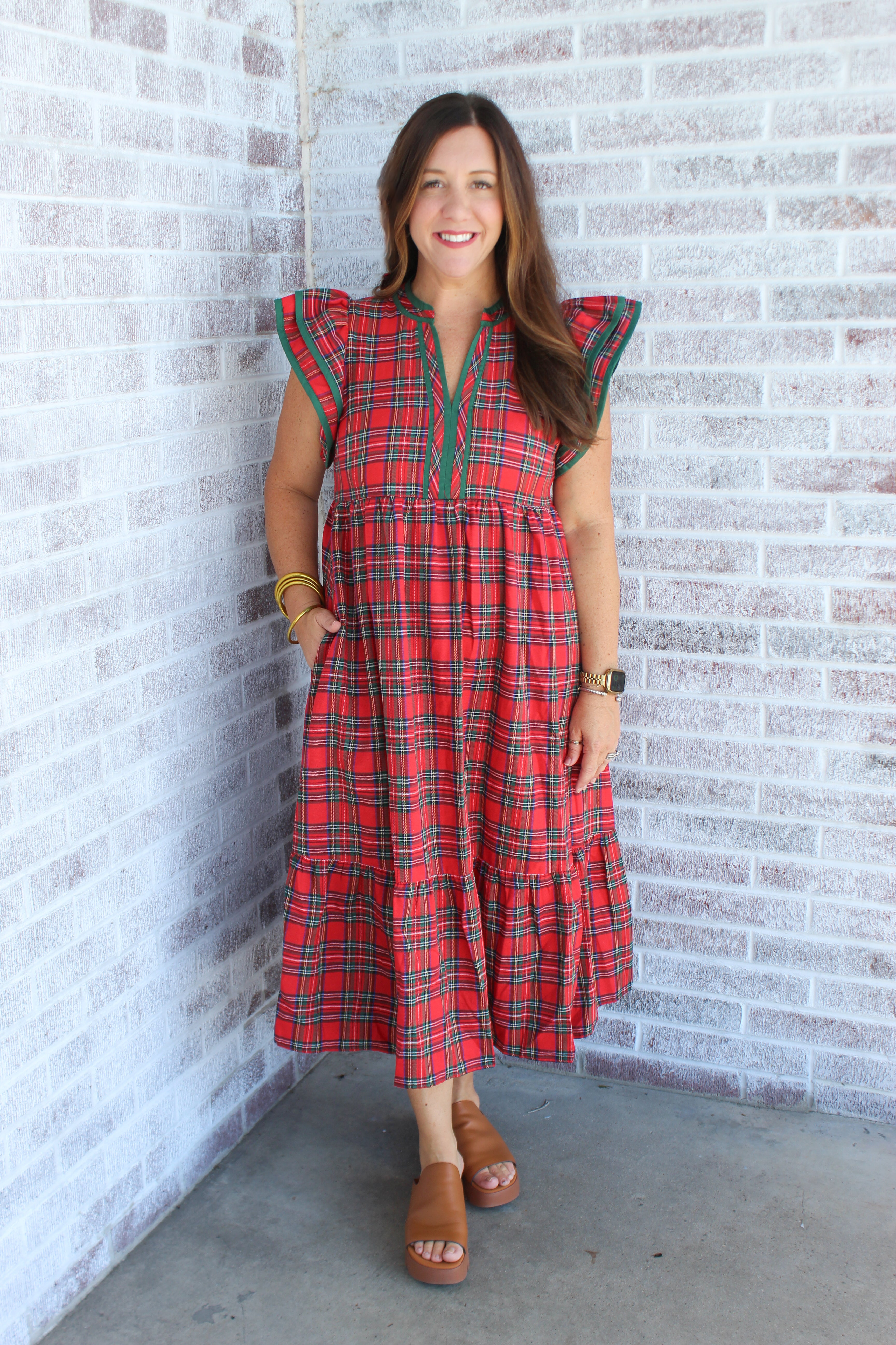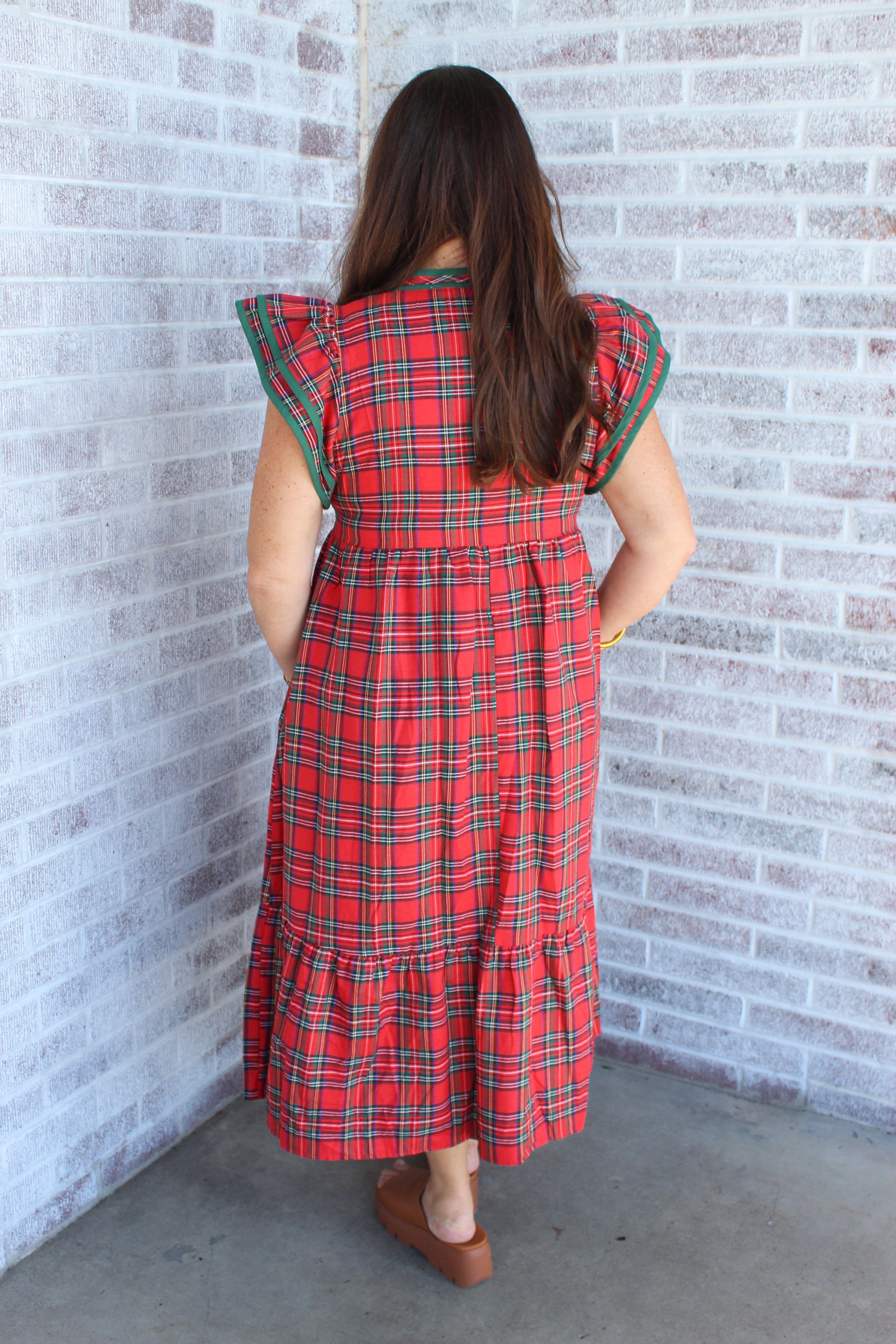 January & May Holiday - Oh What Fun Plaid Flutter Sleeve Midi Dress
