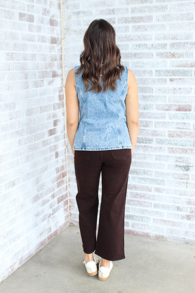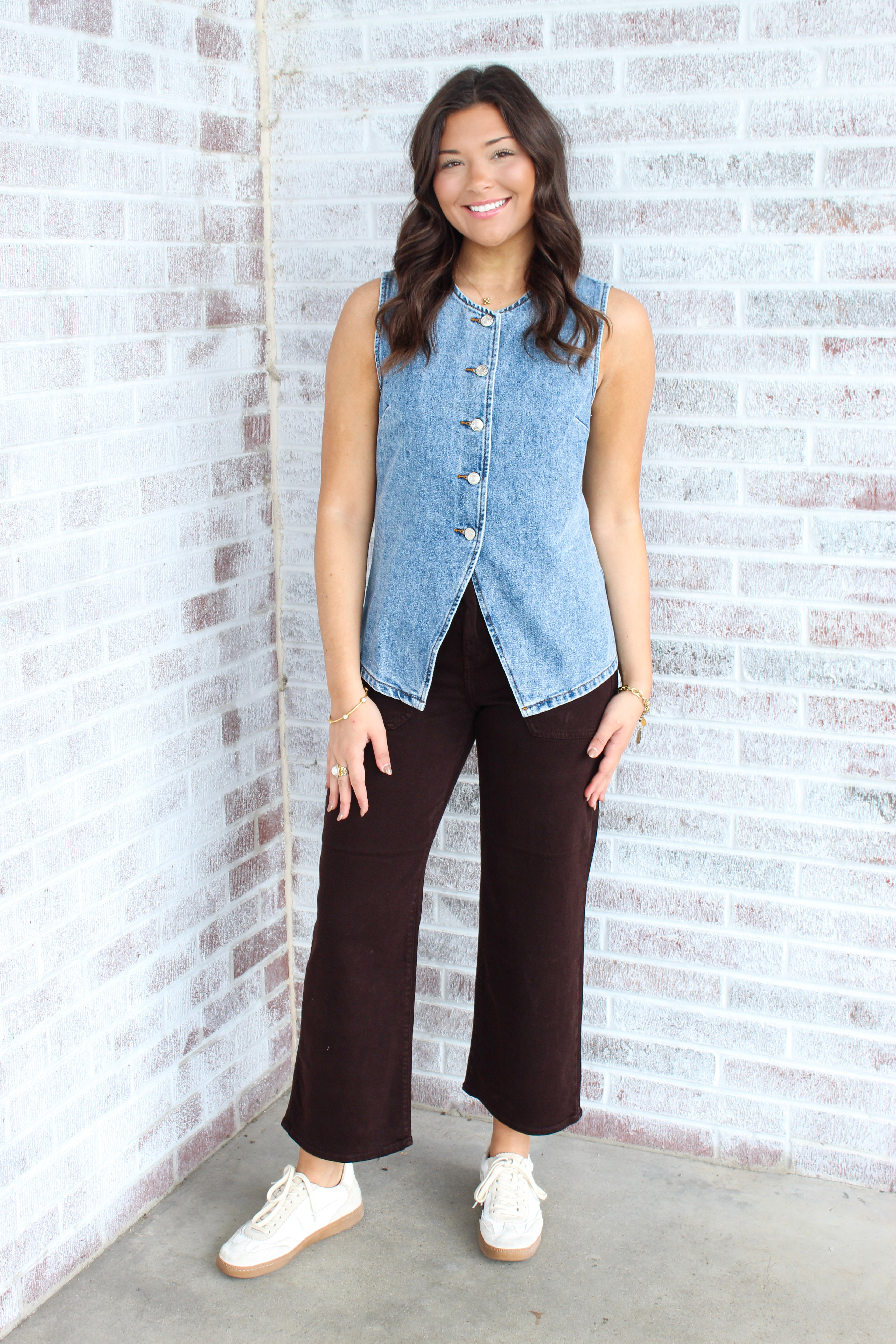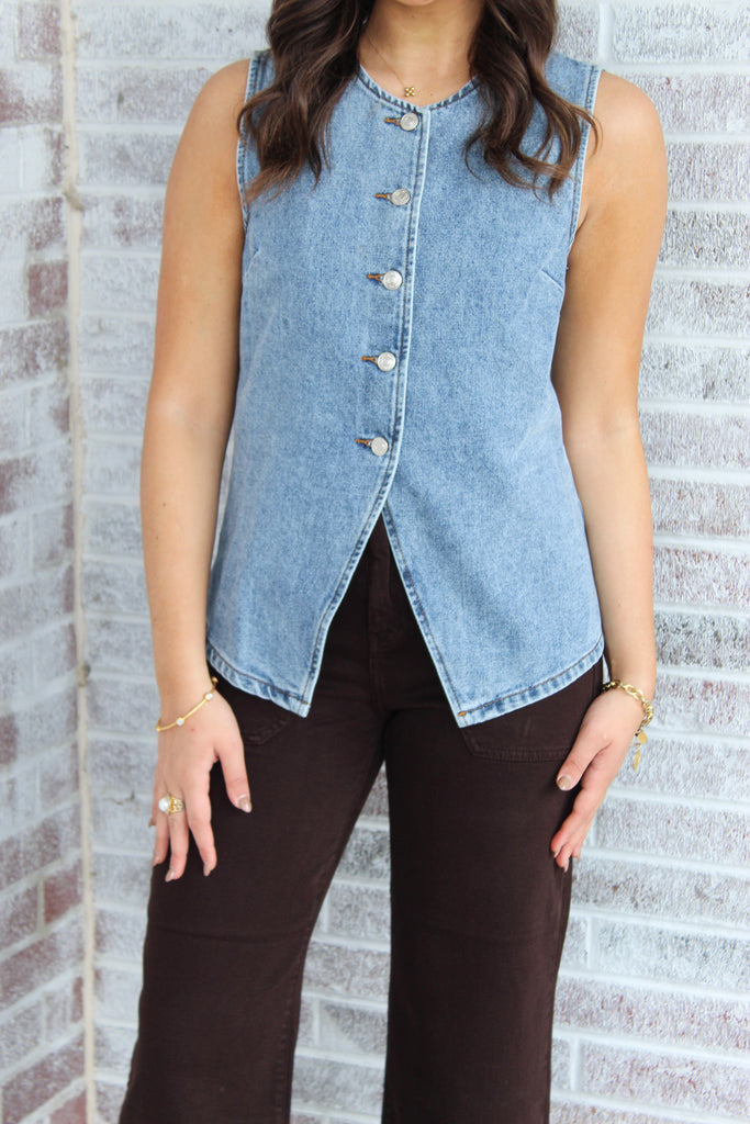 Elevate your fall wardrobe with the Miss Love Front Split Denim Vest. Featuring a refined button closure and a stylish split hem, this vest perfectly blends comfort with modern design. Ideal for country concerts or casual outings, it layers seamlessly over your favorite outfits, adding a touch of effortless southern sophistication.