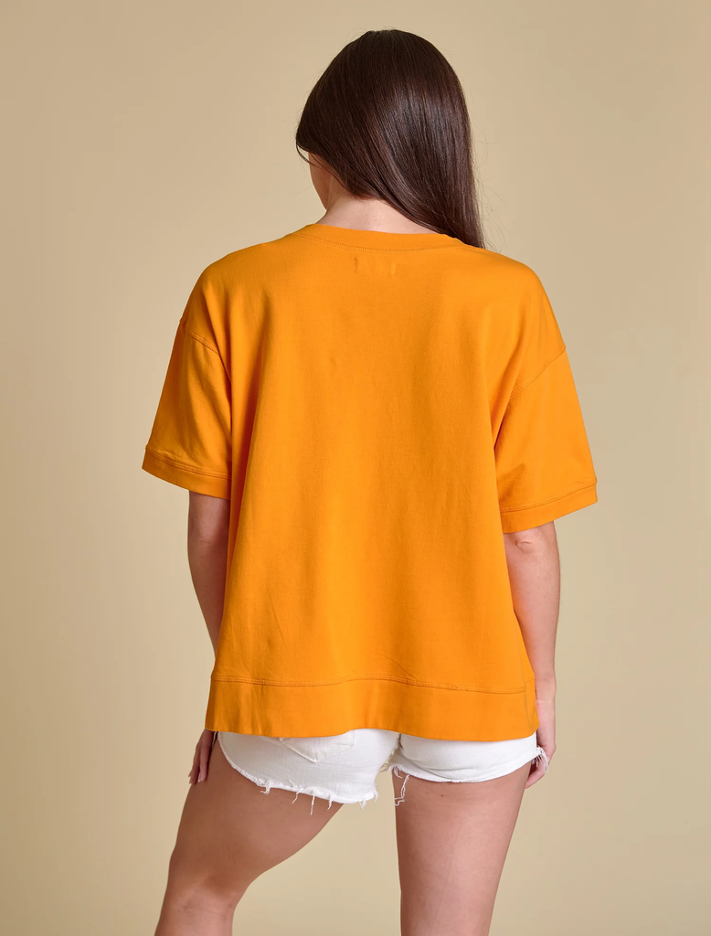 This boxy pullover is a modern twist on collegiate cool — made to turn heads from tailgate to town. Featuring an oversized fit, glitter script piping, and ultra-soft French terry fabric, it’s the perfect balance between all-day comfort and standout style. We're styling it with leather shorts and boots for game day, or layered over a mini dress for an unexpected, off-duty moment.