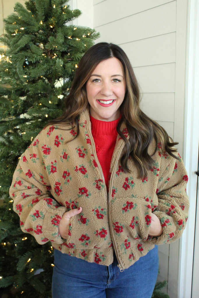 January & May - Calling Santa Comfy Floral Print Sherpa Zip Up Jacket