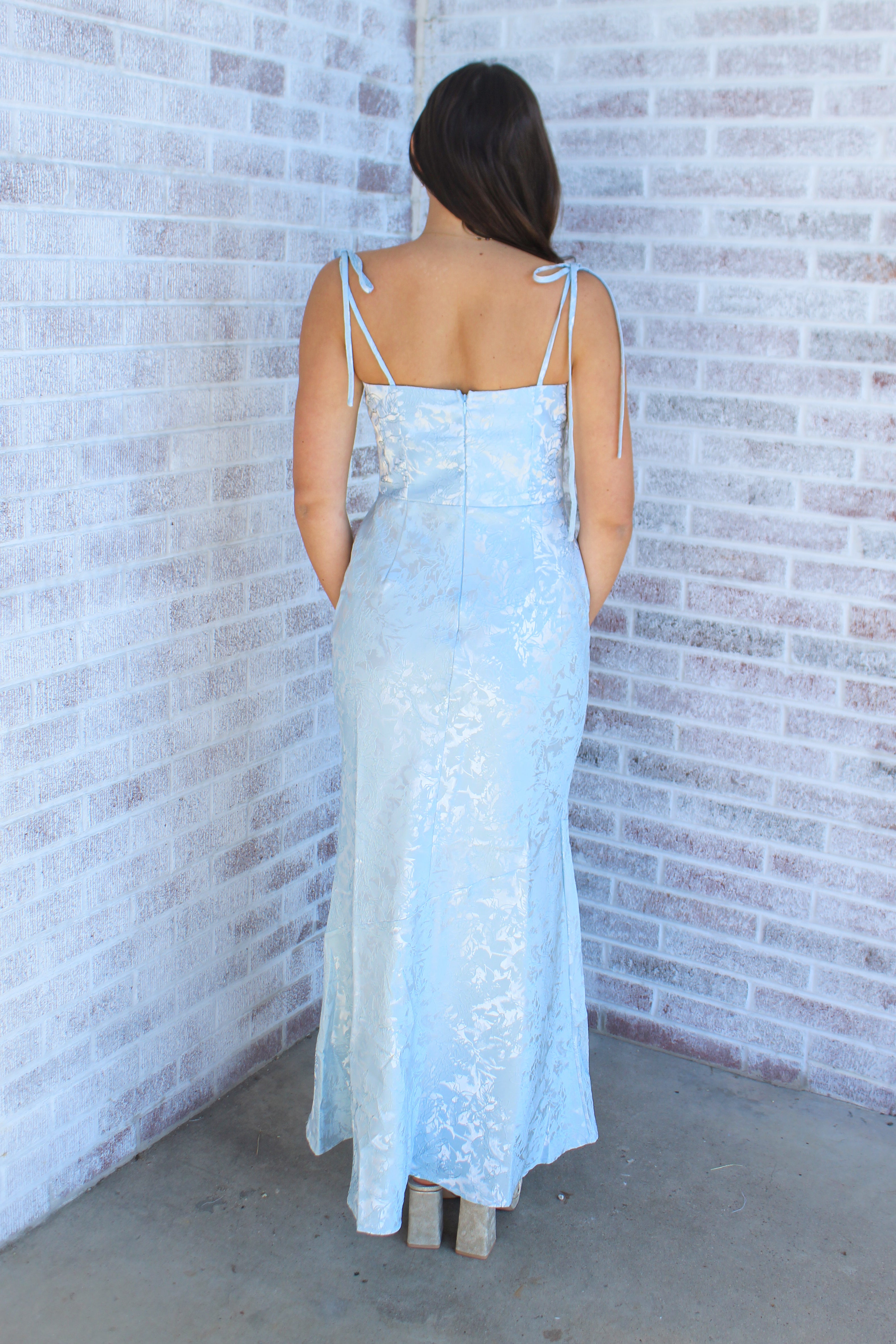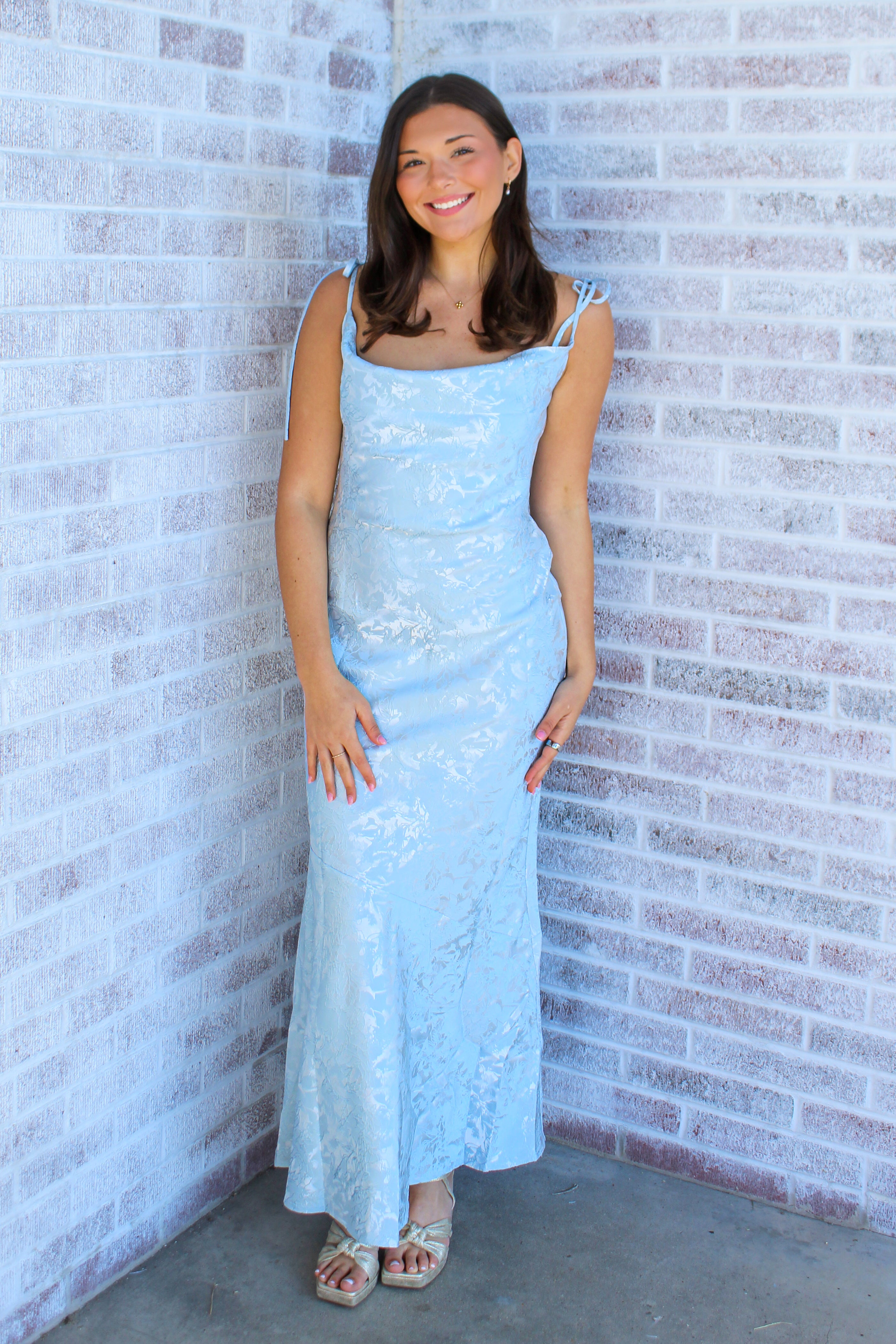 Elevate your wardrobe with the Jade Jacquard Floral Maxi Dress, crafted from exquisite jacquard blue fabric that evokes the serenity of a tranquil garden. The delicately tied shoulder detail enhances the elegance of the draped neckline, creating a silhouette that captures the essence of refined femininity and timeless sophistication.