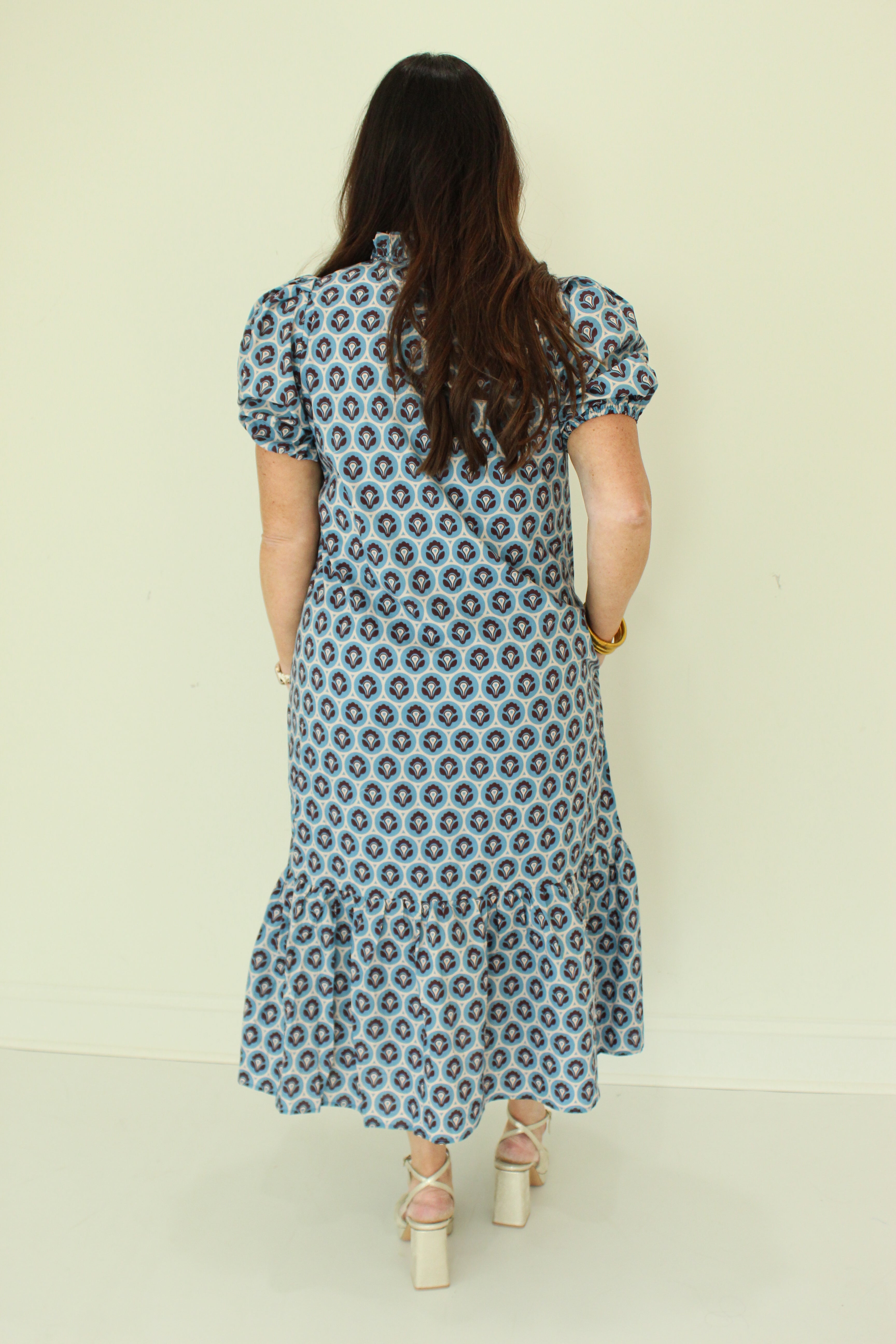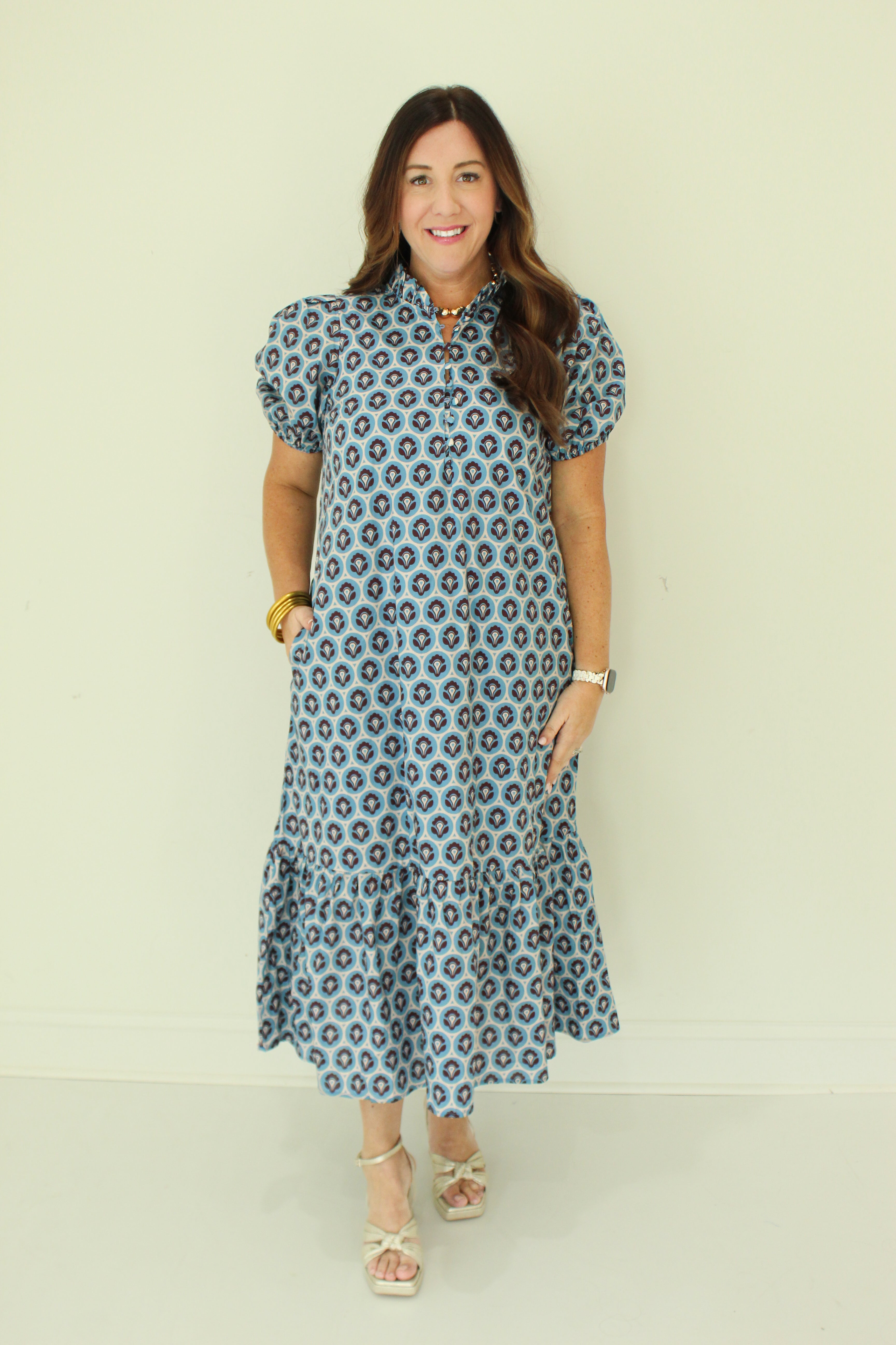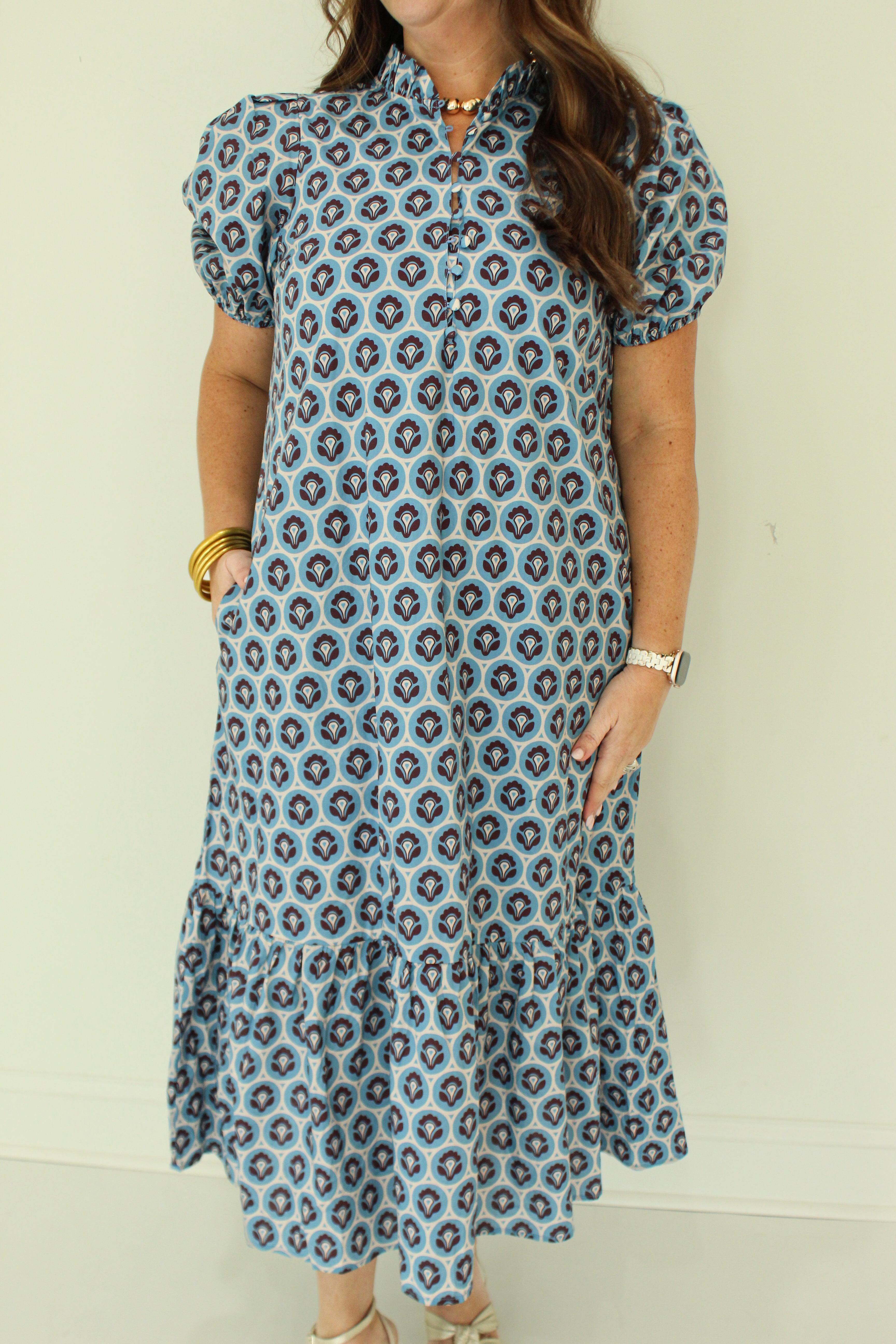 Embrace the essence of sophisticated femininity with the January & May Forever Like That Patterned Tiered Midi Dress. This exquisite creation boasts a geometric floral motif, delicately enhanced by a fluttering hem and an elegant ruffle collar, evoking a sense of artistry and grace that transforms every occasion into a curated experience of style and poise.