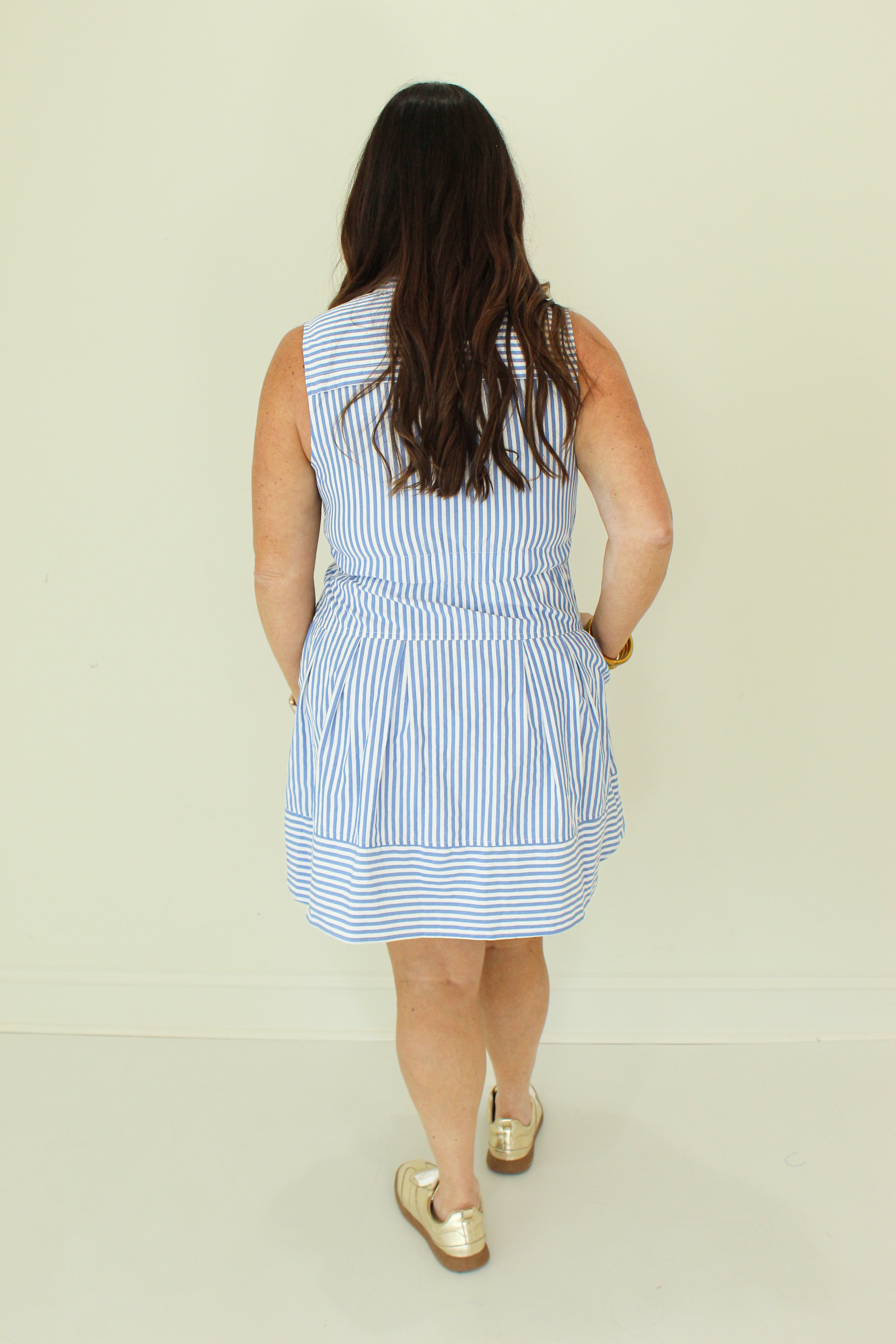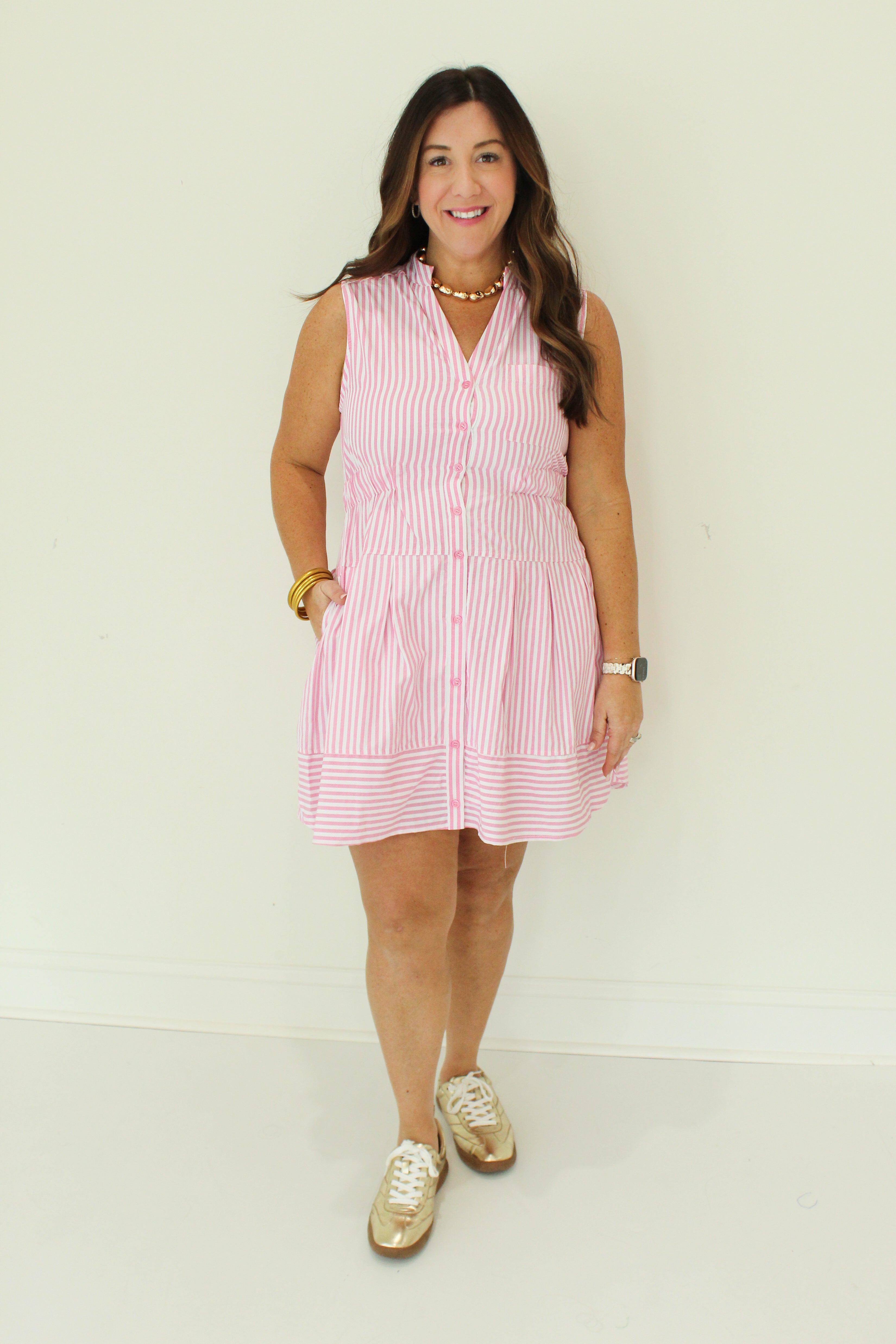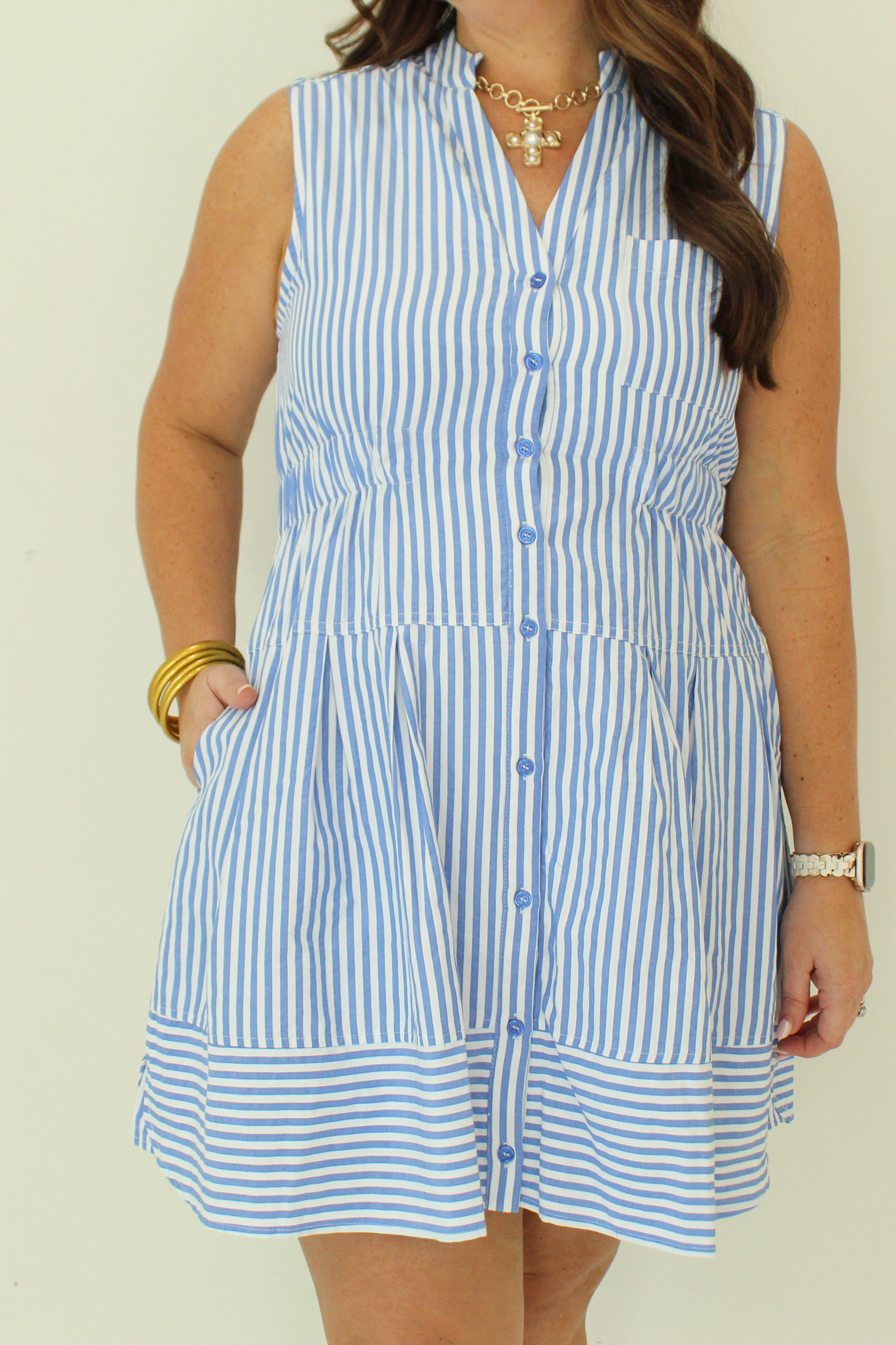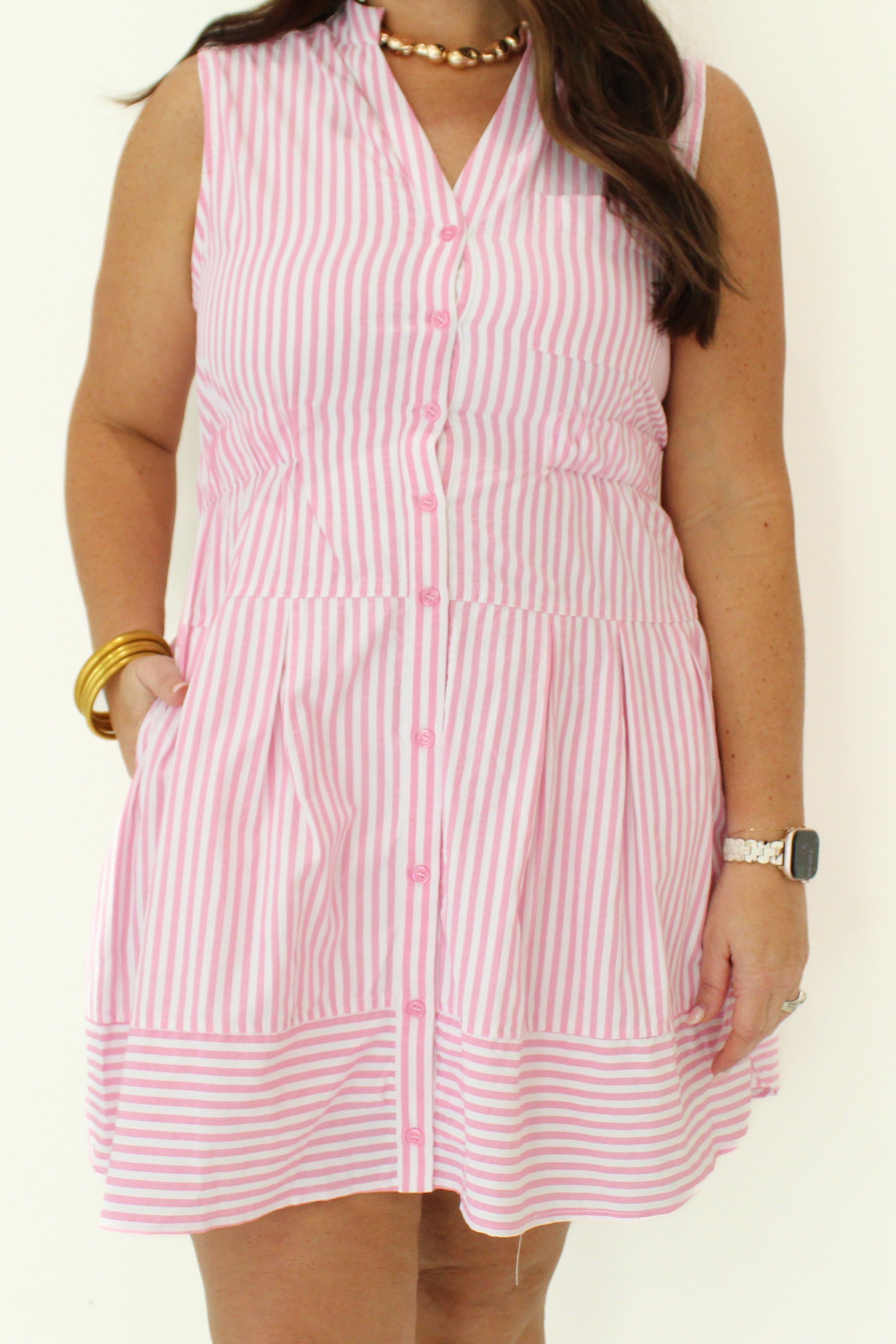 Embodying effortless elegance, the Simple Joy Striped Tank Mini Dress features a sophisticated button front and a delicately pintucked waist that subtly enhances your silhouette. Its refined striped pattern exudes a sense of timeless charm, making it an exquisite choice for both leisurely afternoons and refined gatherings.