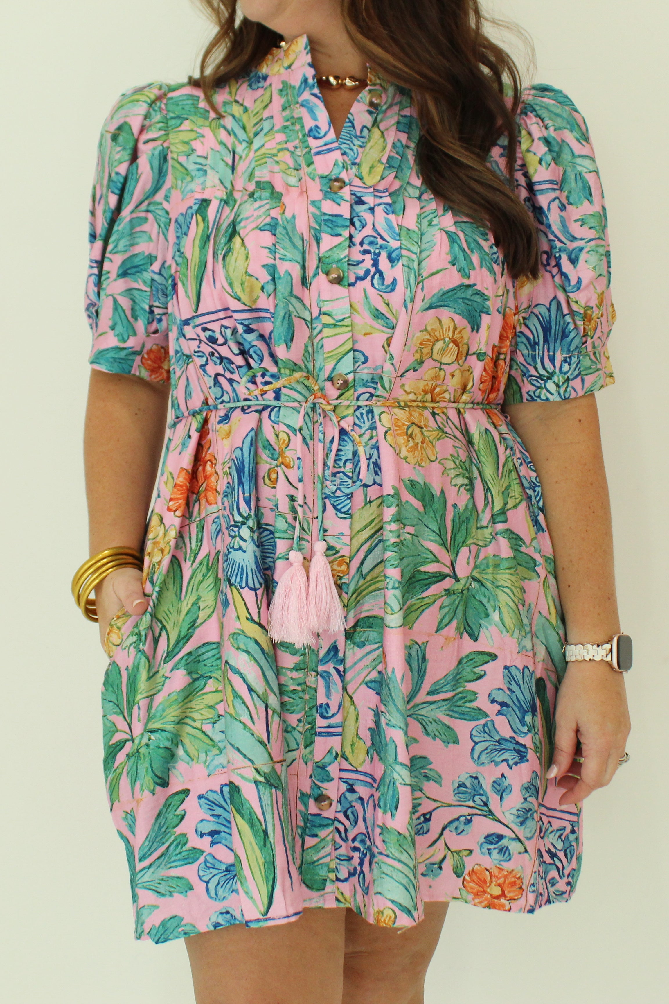 Embodying the essence of an eternal garden, the Timeless Floral Pintuck Tie Waist Dress captivates with its exquisite tropical floral print, meticulously designed to evoke the allure of distant shores. The elegant tie detail cinches gracefully, accentuating the silhouette, rendering it a piece that transcends the mundane and invites you to indulge in a realm of effortless sophistication.