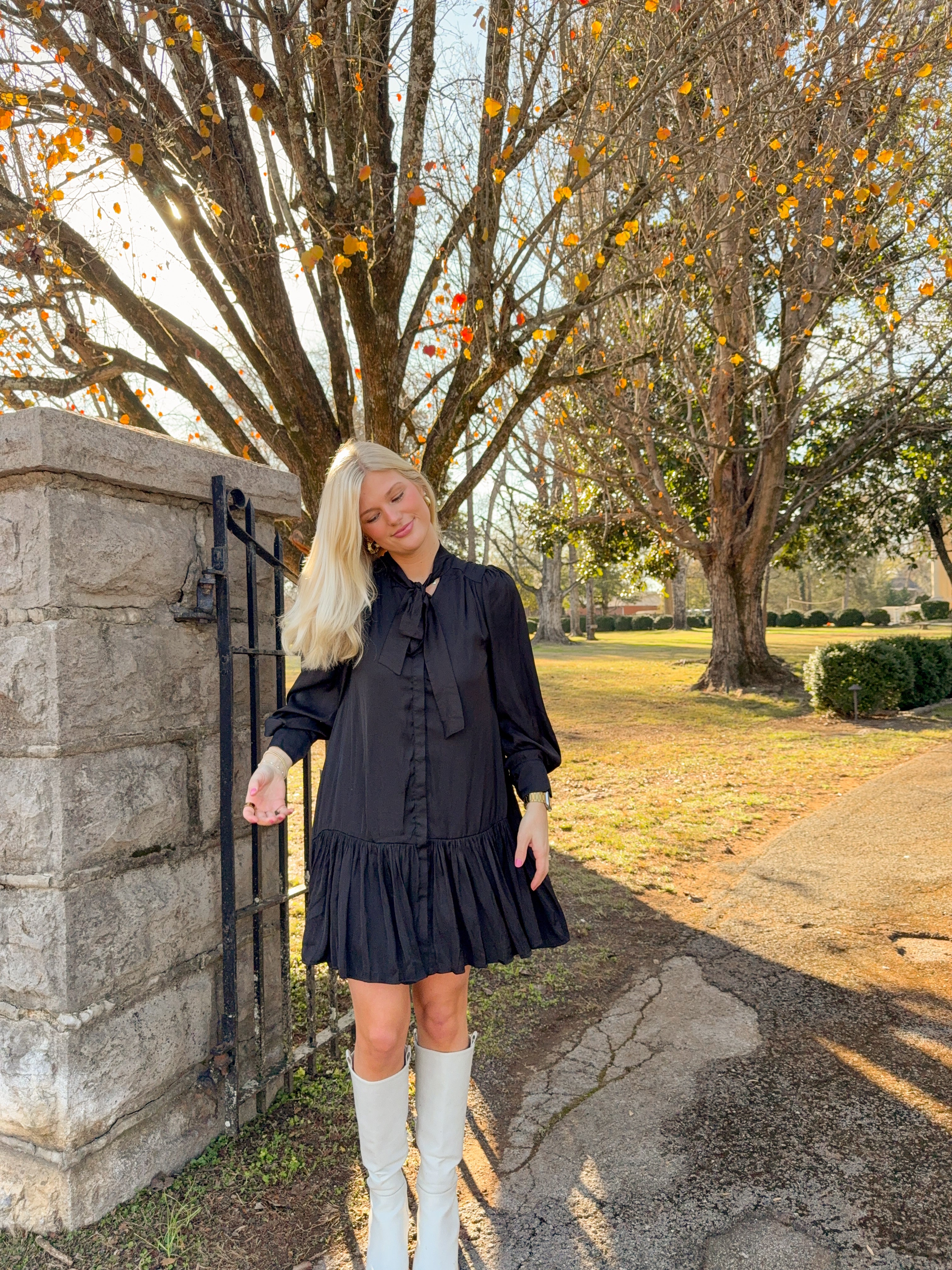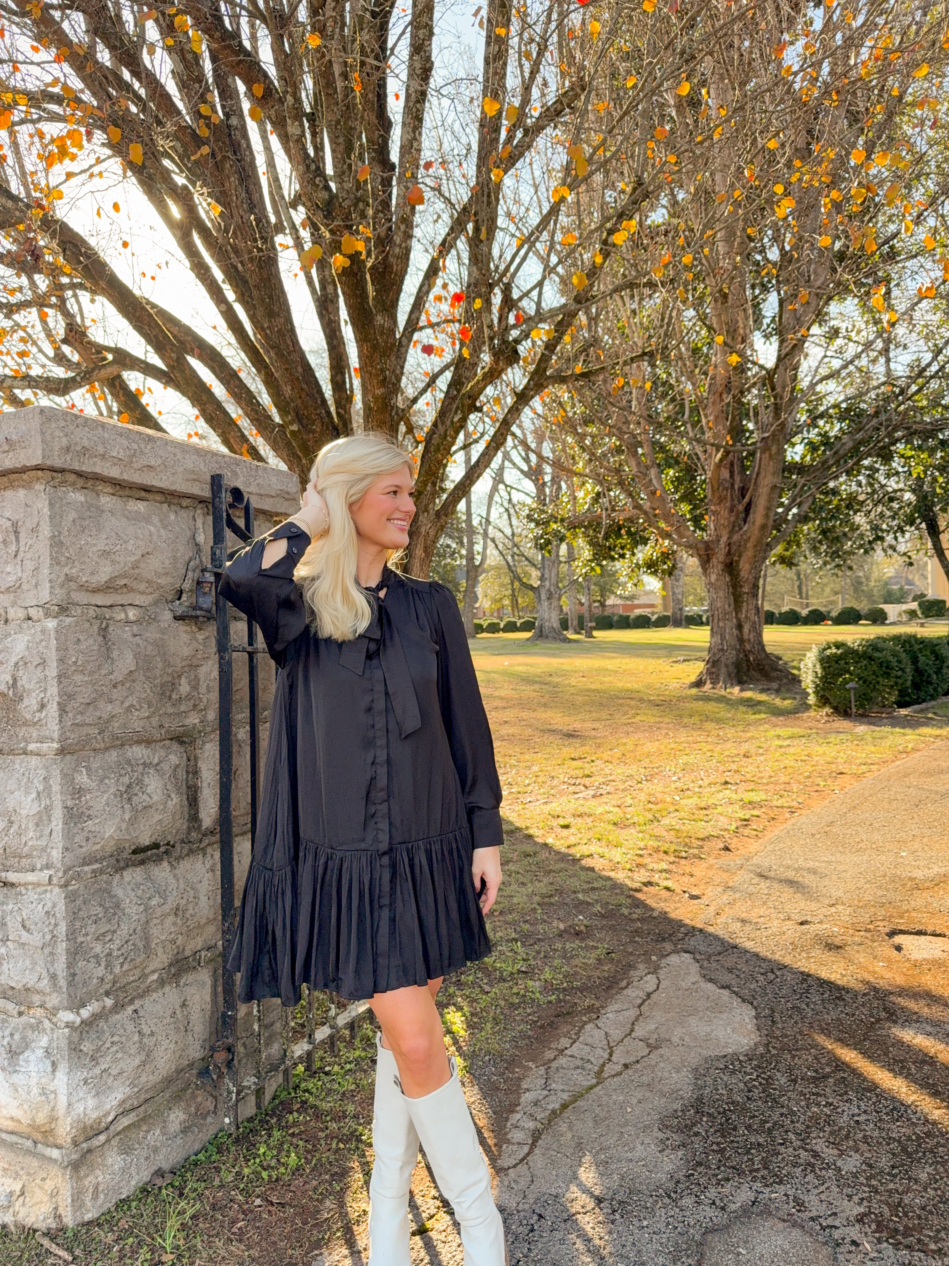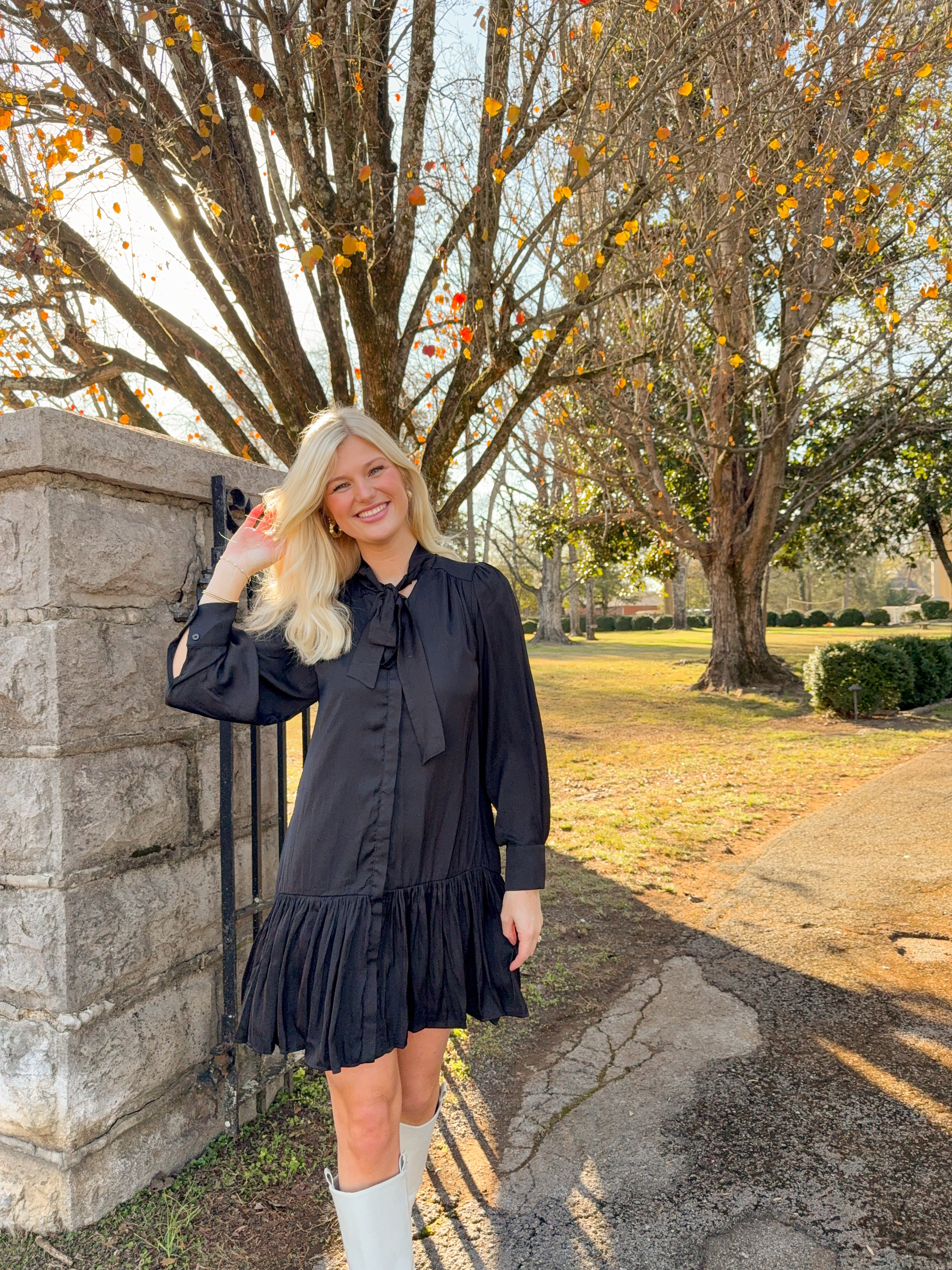 Ring in the season with this chic tiered mini dress featuring a flirty tie neck that adds instant personality to your party lineup. The cascading layers create beautiful movement and dimension, while the classic black hue keeps things effortlessly sophisticated. Perfect for holiday celebrations, New Year's Eve toasts, or any occasion calling for a touch of playful elegance. Dress it up with heels and statement jewelry for maximum impact.
