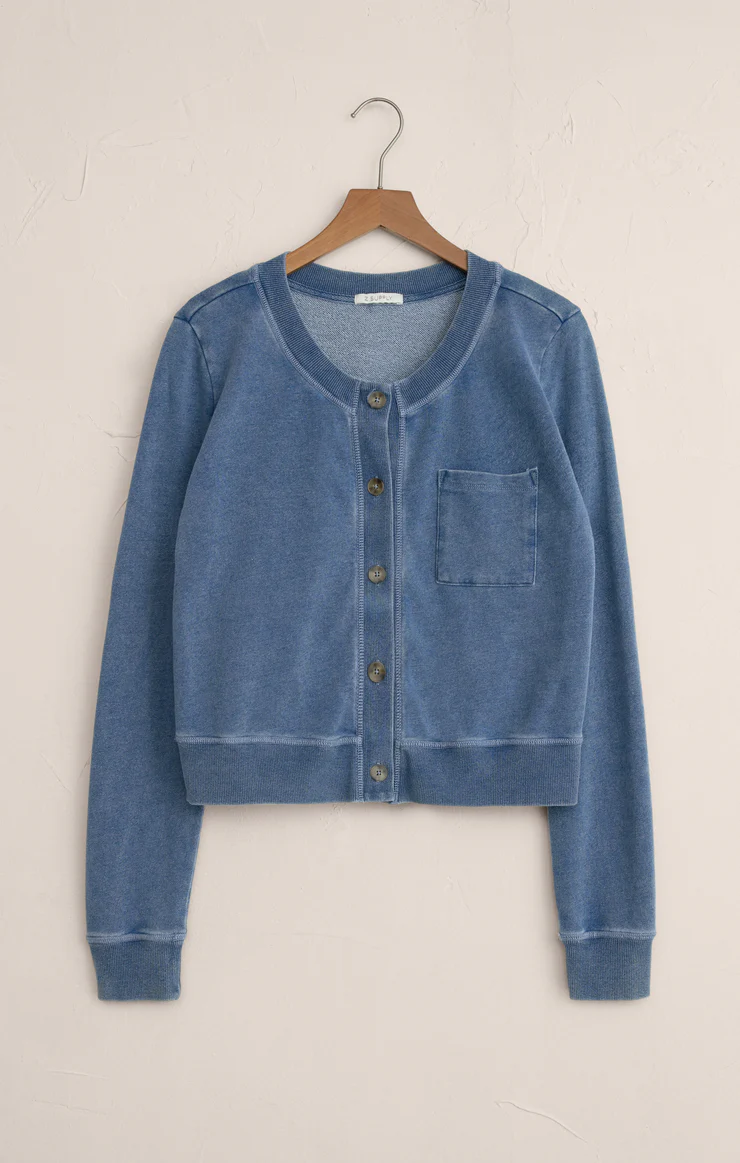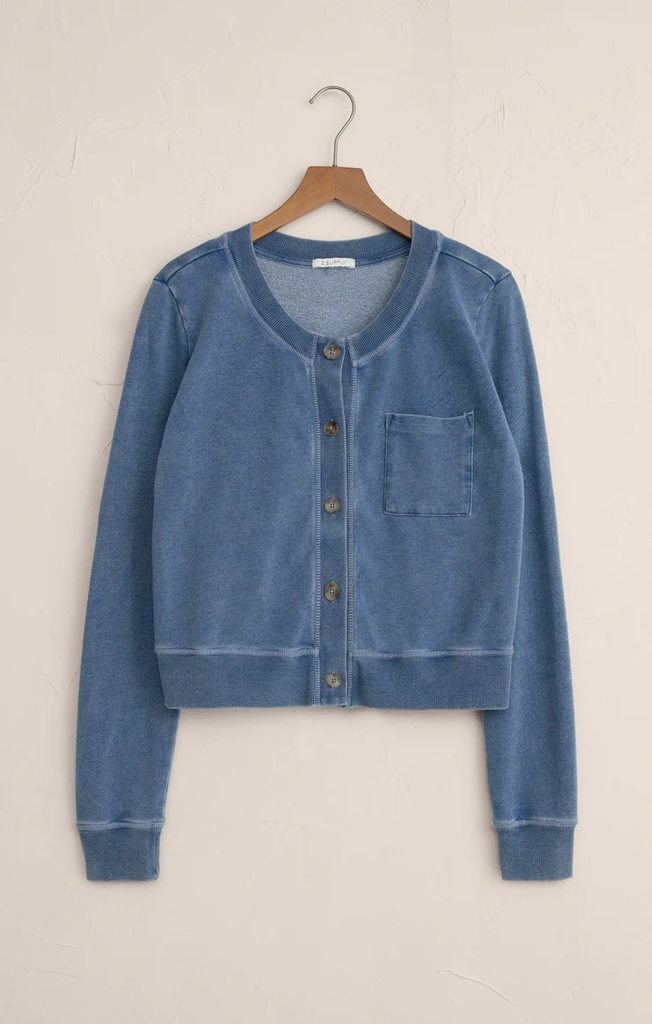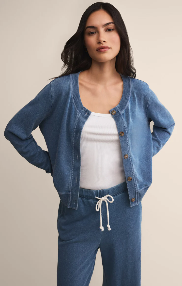 This relaxed cardigan is made from knit denim french terry, featuring a versatile crew neckline and easy-going silhouette. So comfortable, it just may beceome your new favorite laid-back layer.