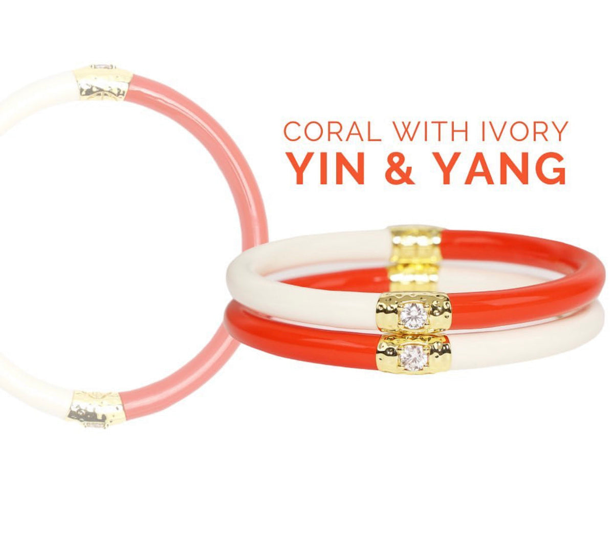 Our set of two Pink & Ivory White Yin Yang bangles are beautiful orbs that combine bright and light and are joined with our exclusive Universe bead that is gold plated brass and has a clear faceted crystal. Of course, they are waterproof, soundless, weightless, and TSA Proof. BTW…we have mini Yin Yang ASB for kids.