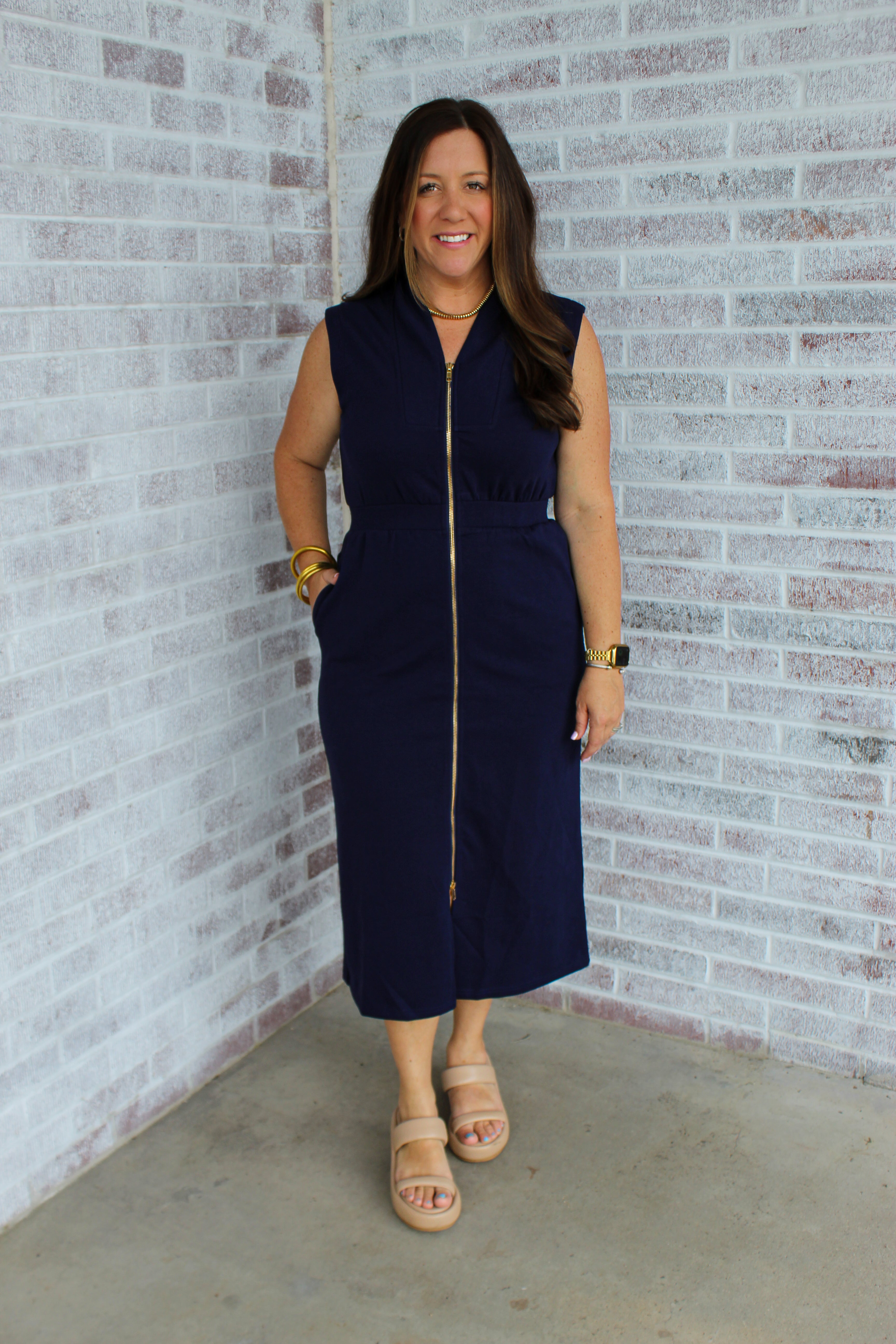 Expertly designed for maximum comfort and style, the January & May - Bring Me To Life Solid Sleeveless Zip Up Midi Dress boasts a smocked waist and performance fabric. The zipper detail adds a touch of edge to this versatile and flattering dress, available in two stunning solid colors. Elevate your wardrobe with this must-have piece.