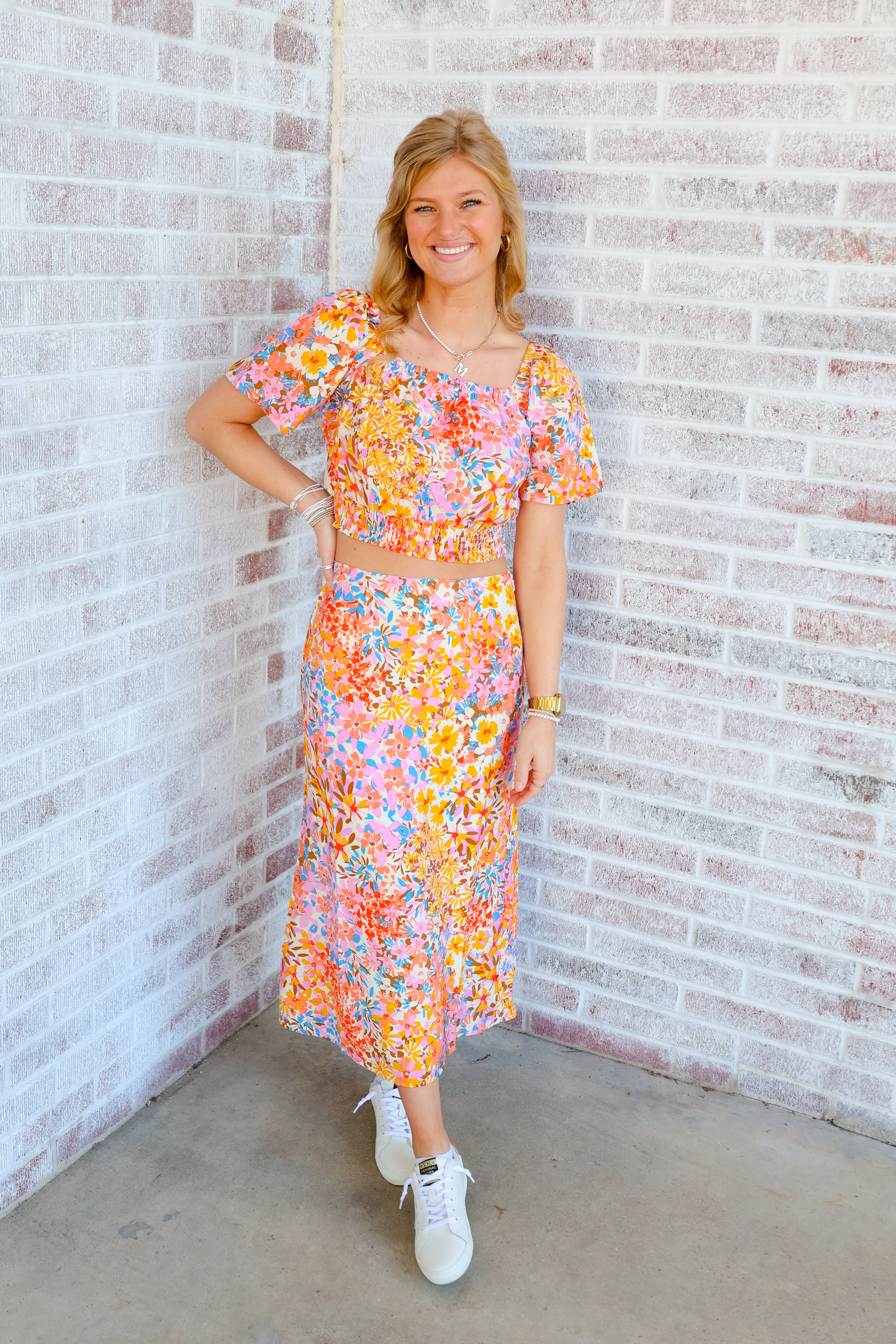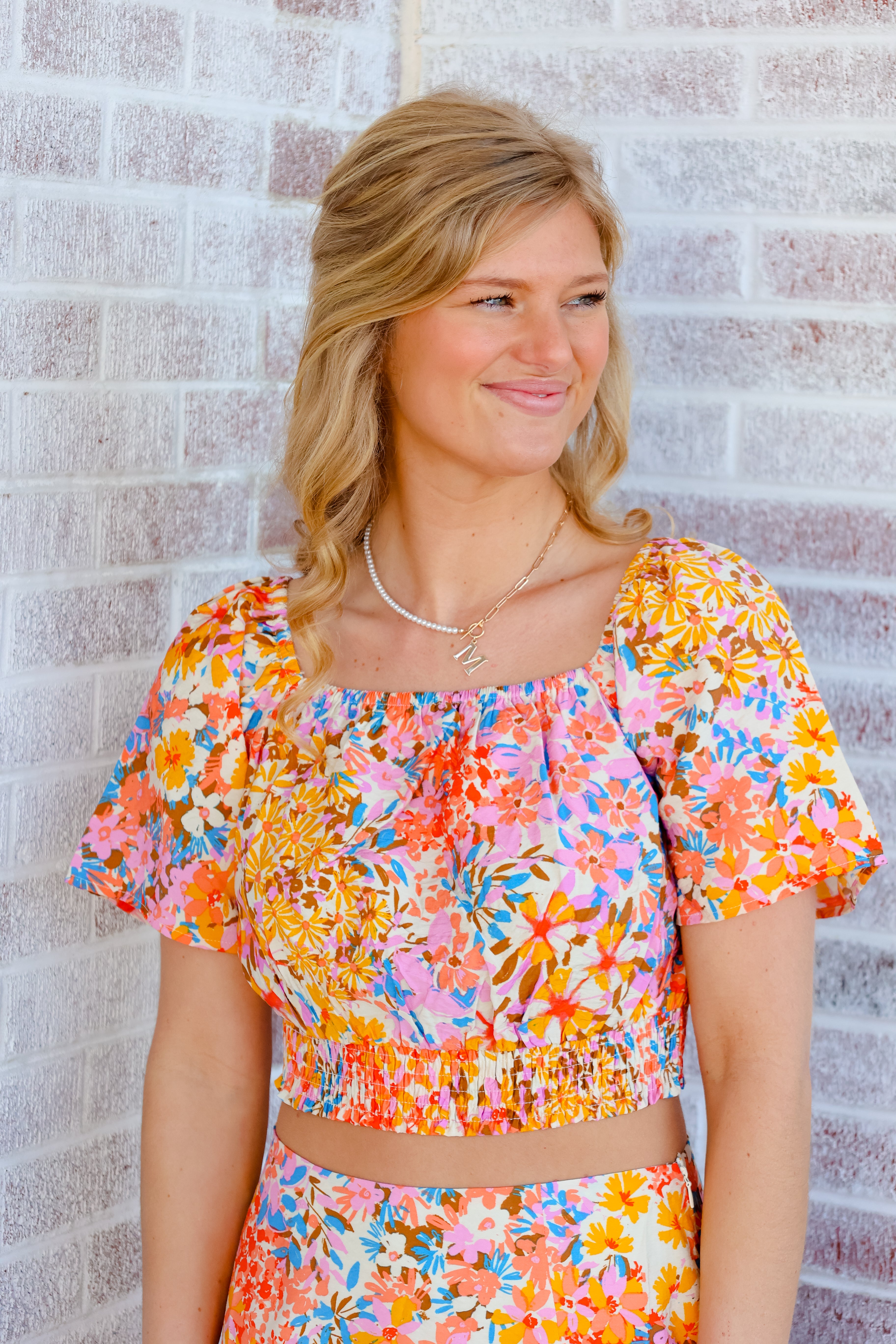This Moonscapes Top features a lovely floral print, perfect for adding a touch of feminine charm to any outfit. The square neck and short sleeves add a sophisticated touch, while the fitted smocked waist creates a flattering silhouette. With its cropped length, this top is a must-have for any fashion-forward wardrobe. Match Meredith and grab the Moonscapes Midi Skirt