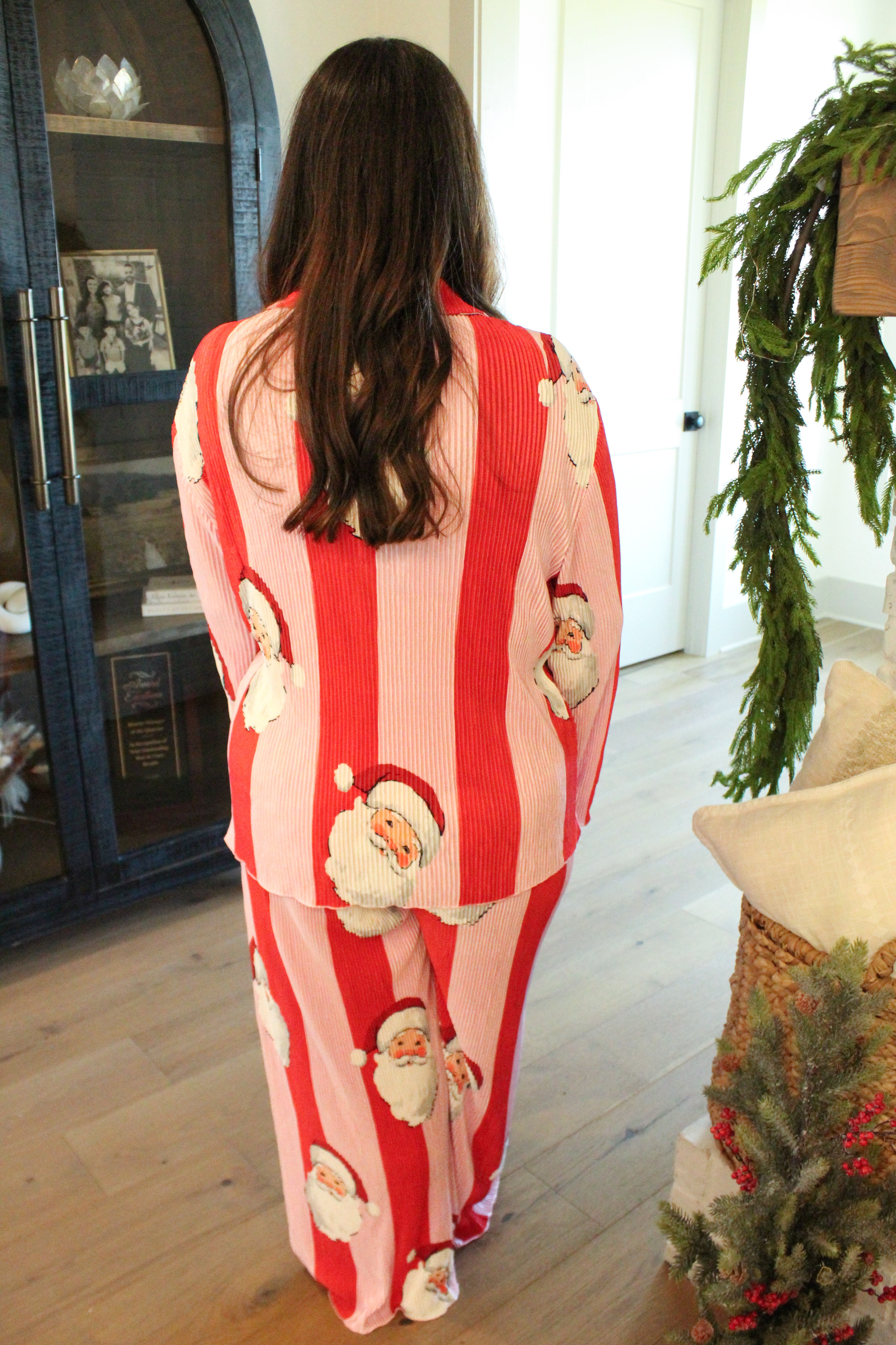 Celebrate the season in style with this charming pajama set featuring a playful Santa-inspired print rendered in sophisticated wild indigo tones. Pleated detailing adds architectural interest to the design, elevating traditional holiday sleepwear into something truly special. The coordinated top and bottom pieces offer versatile styling options, whether worn together for cozy nights or mixed with other pieces in your collection. A refined take on festive pajamas that doesn't sacrifice comfort for elegance.